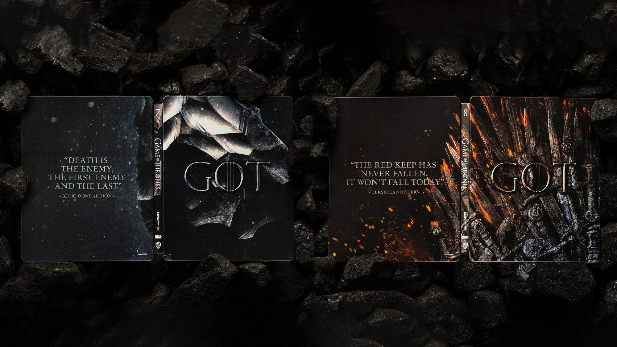 The steelbooks revel in hyper-real close-ups: key objects from each season's storylines, brought to life with the clarity 4K delivers. The animal collection showcases bespoke 3D renders of House sigils, each textured to represent their realm, with a fiery Drogon commanding the outer box.