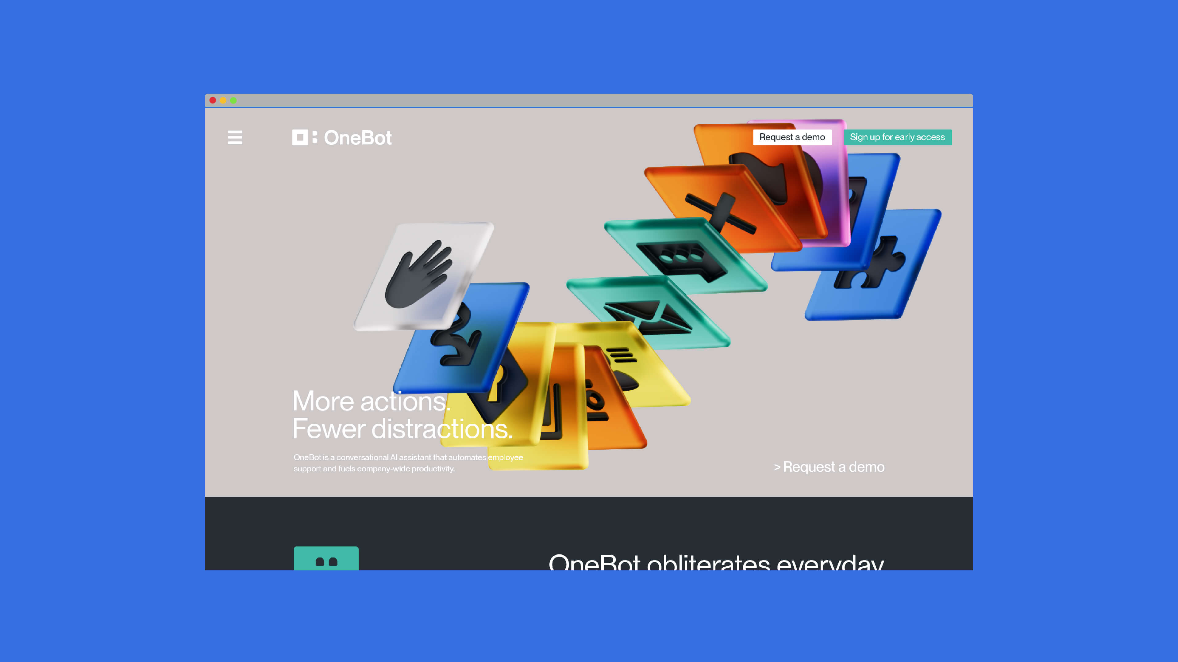 We were tasked to create a brand for OneBot, a conversational AI assistant that automates employee support and fuels company-wide productivity. Designed for rapid setup and easy of use, it’s code-free workflow builder can be implemented by anyone in any department.